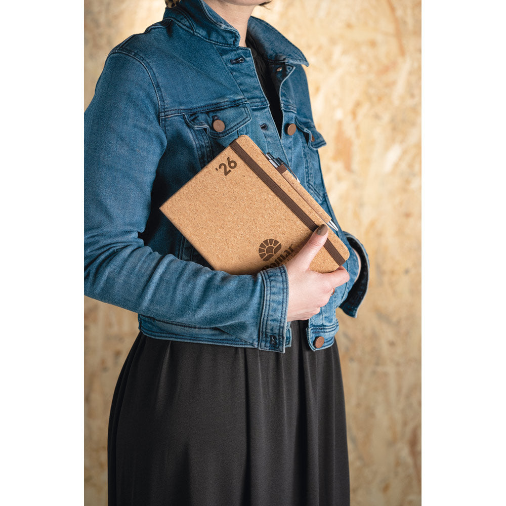 Agenda A5 em cortiça. Possui um suporte para esferográfica (não incluído) e marcador em fita. Está organizado num plano diário, com páginas (70 g/m²) feitas de material certificado FSC™ e outros materiais controlados. Fornecida com bolsa de não tecido. 148x210mm | Bolsa: 205 x 250 mm