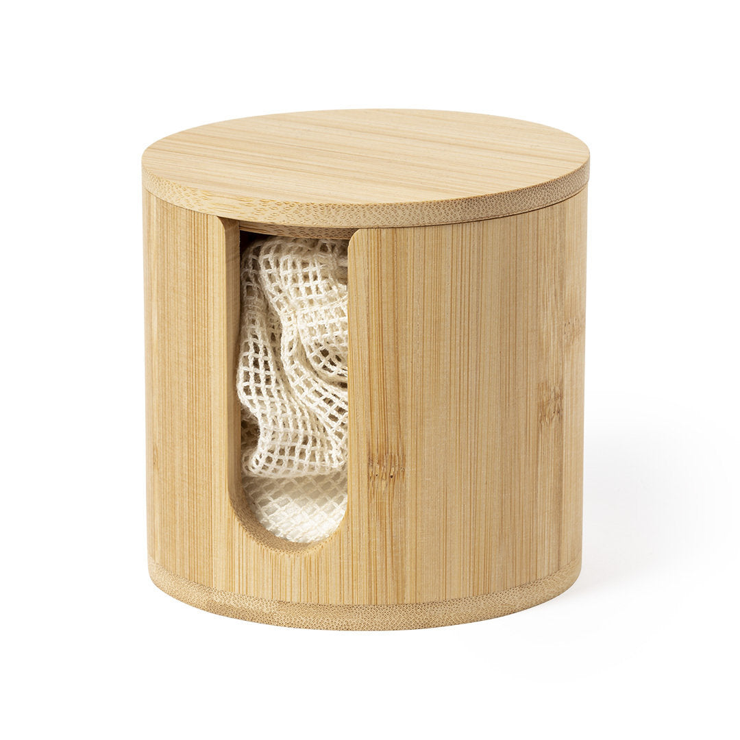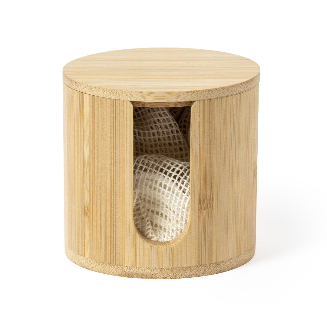 Dispensador para discos removedores de maquilhagem da linha nature, fabricado em bambu para promover a utilização de matérias primas naturais. Inclui 10 discos de algodão reutilizáveis e saco de lavagem. Apresentado numa caixa individual de design eco.