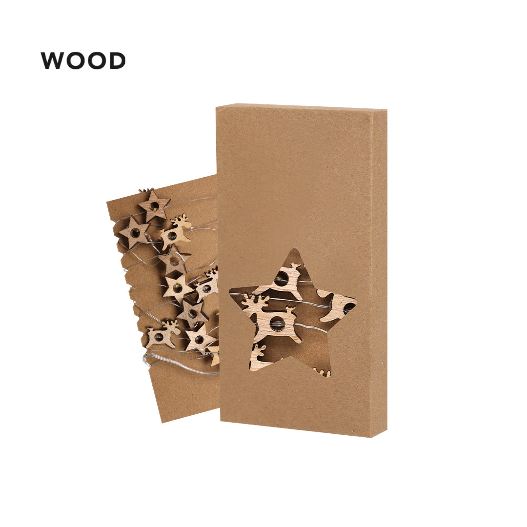 Grinalda iluminada feita de madeira natural. Um acessório de decoração original com enfeites em materiais naturais, combinando formas de estrelas e renas. Com 20 LEDs quentes. Alimentação por bateria (2xAA não incluídas). Apresentado em uma caixa kraft atraente com recorte em forma de estrela.