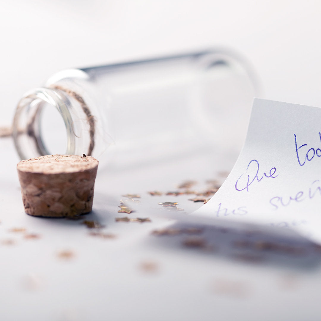 Pequena garrafa para manter seus melhores votos na próxima temporada de Natal. Incluindo um pergaminho de papel e uma garrafa de vidro. Com tampa e fita pendurada, apresentada em uma caixa individual branca.