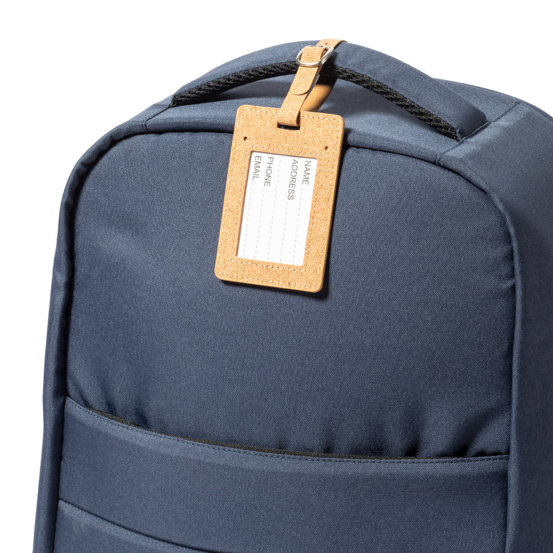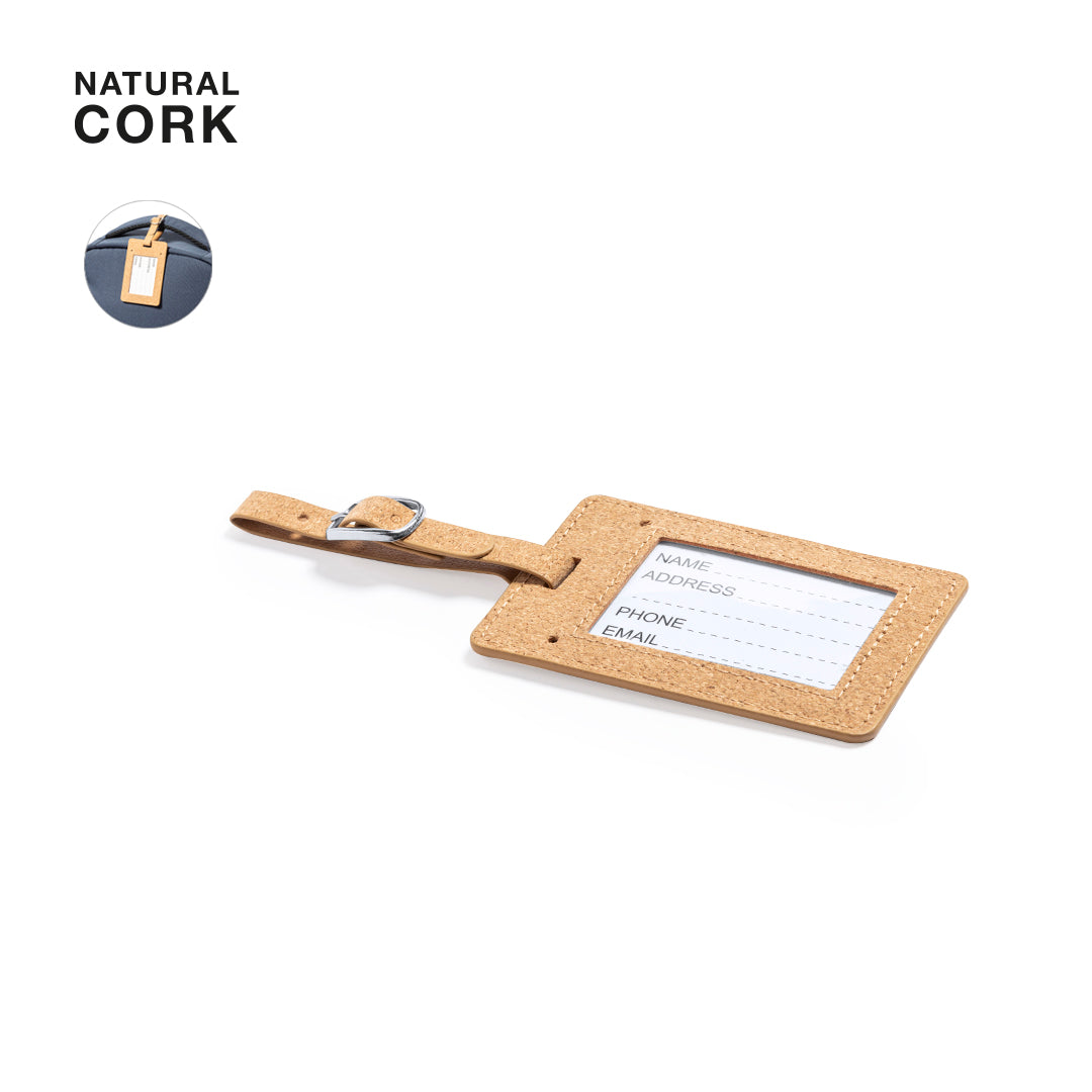 Identificador para malas de linha nature fabricado em cortiça natural. Fita de acoplagem com fecho de fivela metálica e cartão de identificação em inglês.