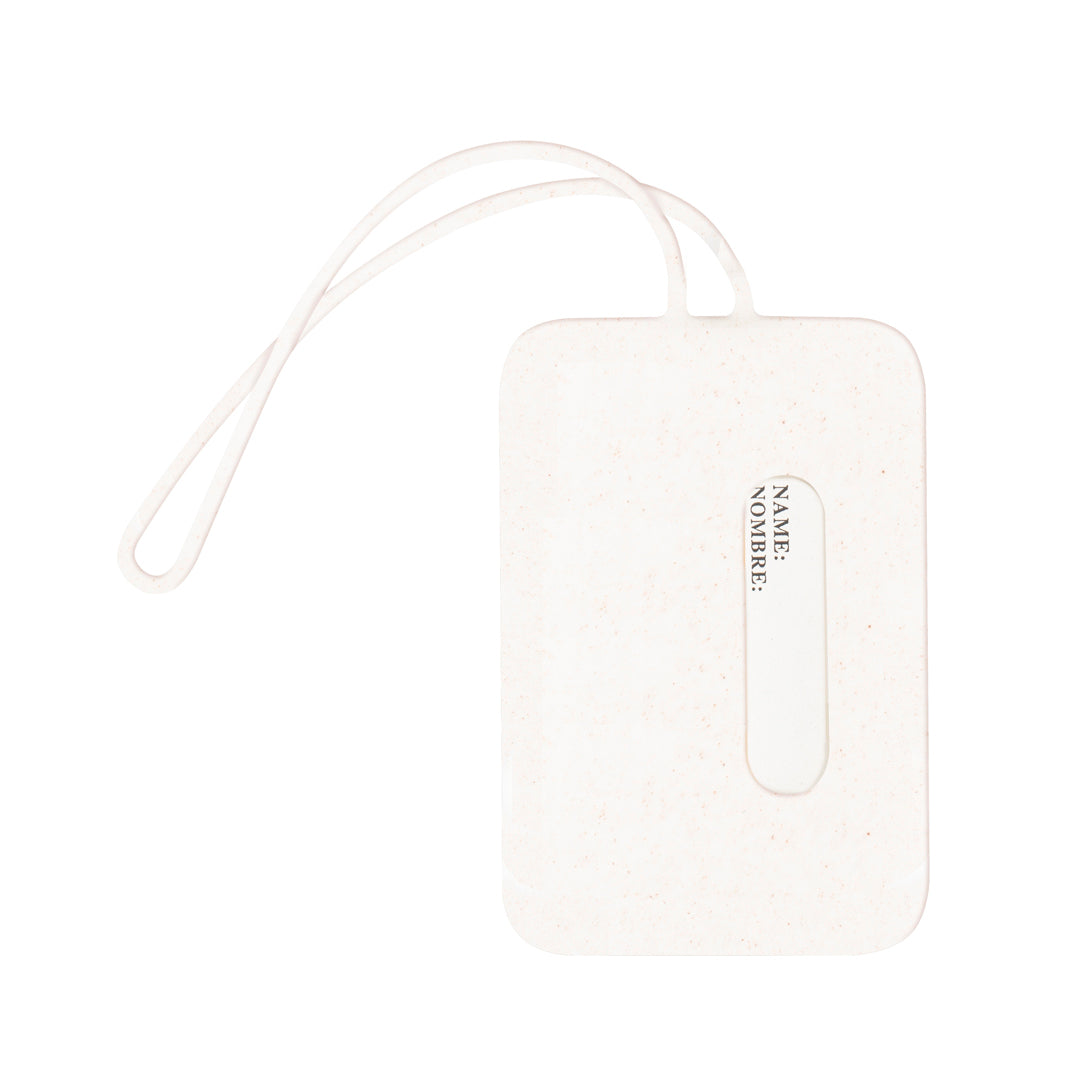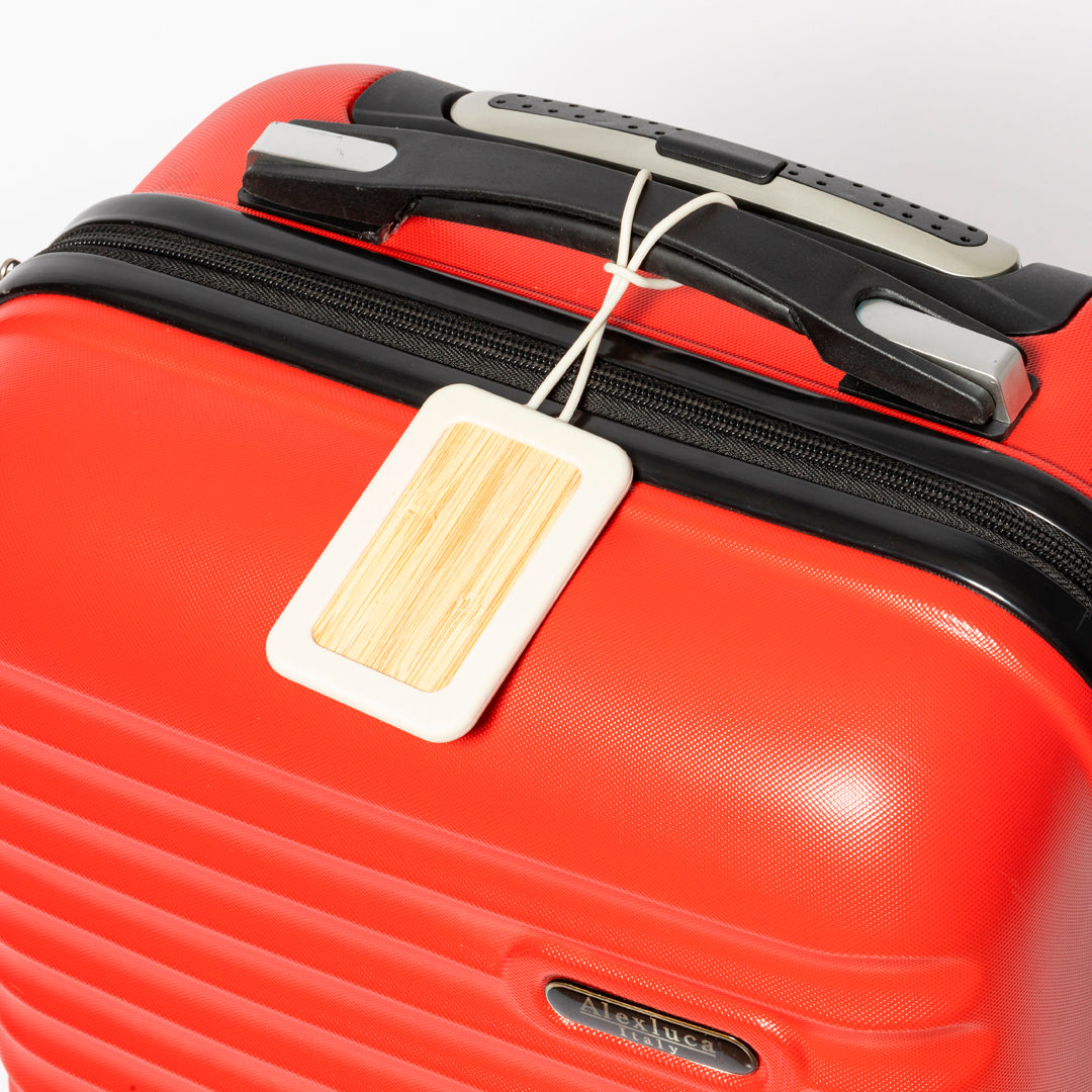 Identificador para malas fabricado em bambu e silicone com veios. Para fixar em qualquer mala graças à sua correia flexível e para indicar informações básicas. Fabricado em silicone de efeito natural, com placa central de bambu. Apresentado numa bolsa de papel reciclado individual.