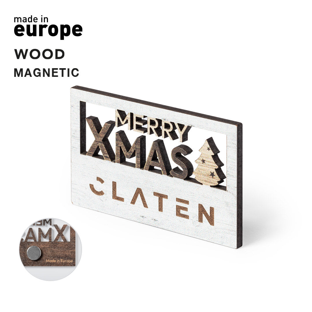Original íman Merry Christmas fabricado em madeira natural, com texto recortado e de original acabamento bicolor. Ampla superfície de impressão e distintivo Made In Europe.