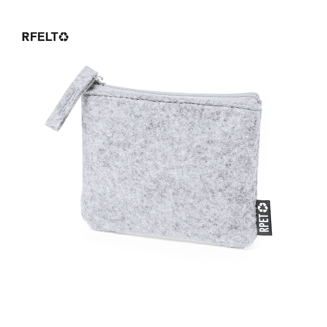 Elegante porta-moedas fabricado em feltro RPET. Compartimento principal com fecho de correr e puxador a condizer. Com distintivo feltro RPET na etiqueta exterior.